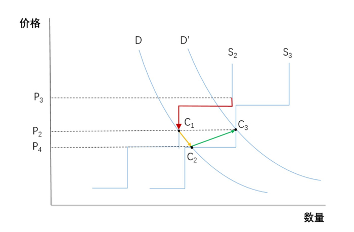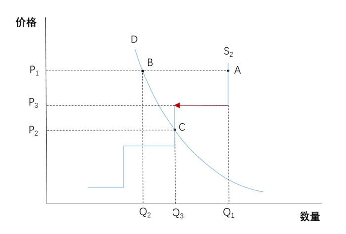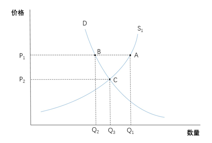 在最理想情况下,市场的供求应该达到平衡,亦即位于C点的位置,此时供求数量均为Q3,产品价格为P2。但实际中市场存在信息滞后,因此供给侧并不总能刚好与需求侧匹配,从而产生稀缺或过剩。