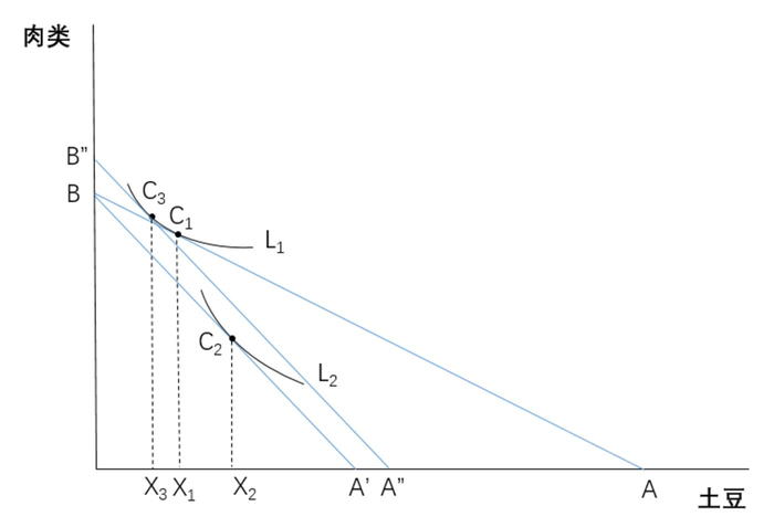要解答这个问题,我们引入一条补偿预算线A”B”,它与土豆涨价后的预算线A’B平行,与土豆涨价前L1相切。换言之,这条补偿预算线相当于做出了这么一个假定:如果我现在给这个家庭补贴一笔钱,让他们足以消除土豆涨价带来的效用偏好变化,恢复涨价前的效用偏好,那么会发生什么?
