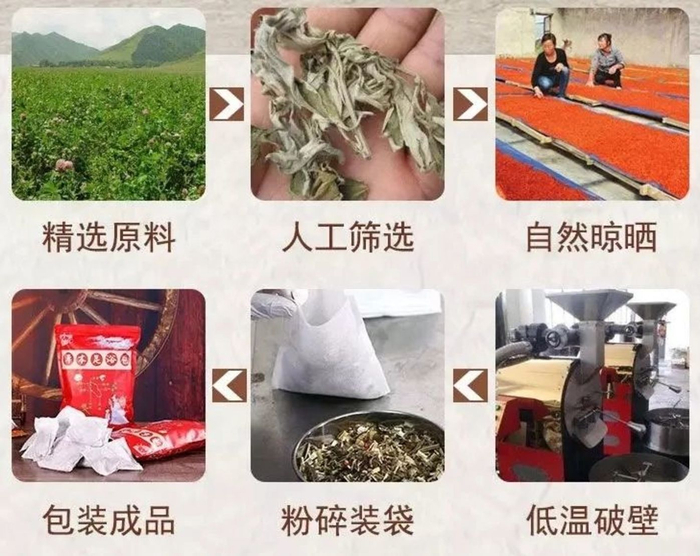 再经过人工精心选材、筛选、清洗、低温萃取、自然冷却、手工包装、多重消毒等多道工序,最终制作出这一包疗效强劲的足浴包。