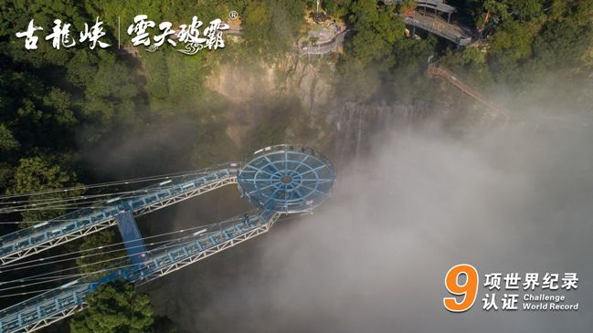 长1314米的高空玻璃线路! 8600平方米面积的玻璃综合体! 72米悬空跨度的玻璃平台! 宽6.8米的观瀑玻璃桥! 垂直差高刺激的丛林飞跃! 由谷底直达山顶的户外扶梯! 包括三项漂流项目记录在内,9项新的世界纪录,在清远古龙峡诞生,并于2019年6月28日在正式发布。