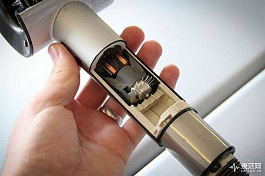 自电吹风发明那天工作原理从没有改变过——用高温蒸发水分,用强风带走水分。工作原理不变不代表械结构不变,戴森Supersonic在手柄中安装了一个数字马达,带动涡轮叶片高速旋转,把空气推到电吹风圆环主体中,然后从风嘴中一圈很窄的缝喷出,圆环中间变成低气压,根据伯努利方程,圆环会吸入后方和周边空气并从风嘴方向喷出。Supersonic只要手柄处吸入小量空气,即可喷出10倍 以上的空气,效率非常高,而且简化了电吹风结构,减重效果非常明显。