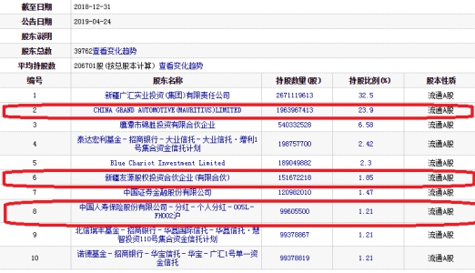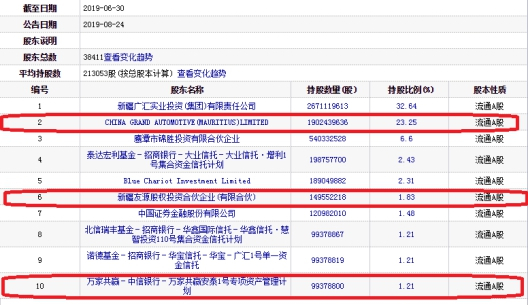 CHINA GRAND AUTOMOTIVE(MAURITIUS)LIMITED为第二大股东,持股量由19.64亿股减持到19.02亿股,减持6152.78万股,持股比例由23.9%降至23.25%。新疆友源股权投资合伙企业(有限合伙)为第六大股东,持股量由1.52亿股减持到1.50亿股,持股比例由1.85%降至1.83%。