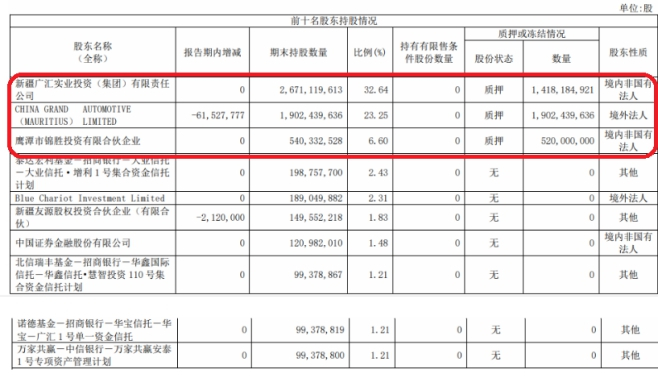 截止报告期末,广汇汽车前十大股东中有三家股东存在股份质押行为,分别为新疆广汇实业投资(集团)有限责任公司质押14.18亿股,CHINA GRAND AUTOMOTIVE(MAURITIUS)LIMITED质押19.02亿股,鹰潭市锦胜投资有限合伙企业质押5.2亿股,三家股东质押共计38.4亿股。