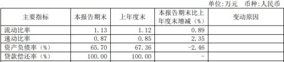 截至报告期末,广汇汽车流动比率1.13%,同比增加0.89%,资产负债率65.7%,同比下降2.46%,贷款偿还率100%,同比无变化。