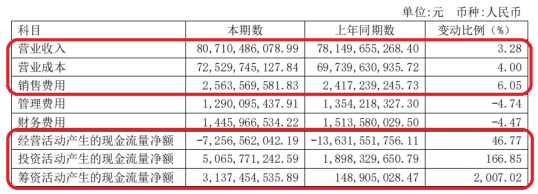 截至2019年上半年末,广汇汽车上半年营收807.10亿元,较去年同期上涨3.28%;营业成本725.30亿元,同比上涨4.0%;销售费用25.63亿元,同比上涨6.05%;经营活动产生的现金流量净额-72.57亿元,同比上涨46.77%;投资活动产生的现金流量净额50.66亿元,同比增涨166.85%;筹资活动产生的现金流量净额31.37亿元,同比增长2007.02%。