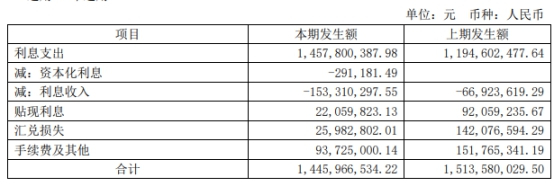 截至报告期末,广汇汽车财务费用共计14.46亿元,同比减少676.13万元,其中利息支出14.58亿元,同比增加2.63亿元;本期资本化利息为29.12万元;利息收入1.53亿元,同比减少8638.67万元;贴现利息2205.98万元,同比减少6999.94万元;兑换损失2598.28万元,同比减少1.16亿元;其他手续费等费用9372.50万元,同比减少5804.03万元。