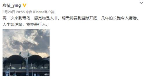 应莹在来青岛前一天发了一条微博,微博中称,“再一次来到青岛,感觉物是人非。明天将要到监狱开庭,几年的长跑令人疲倦。”