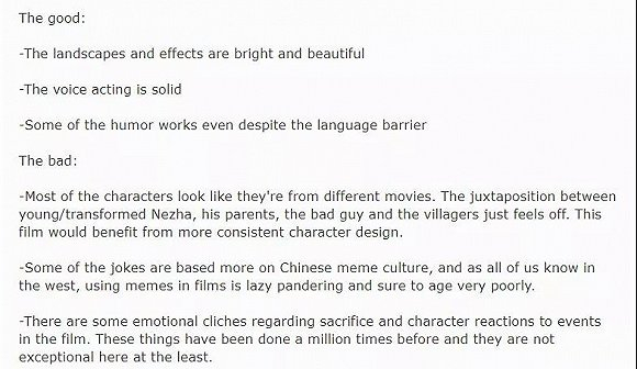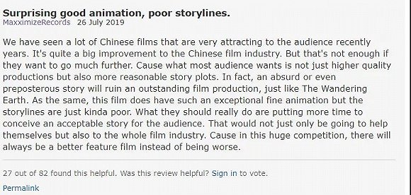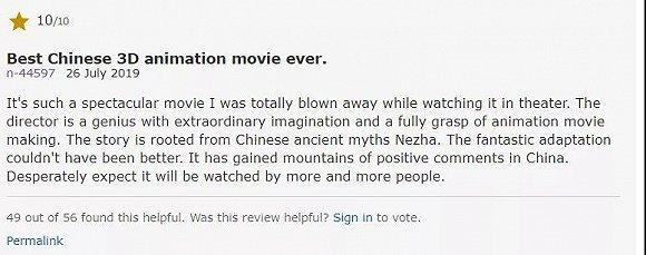 IMDB上被认为“最有帮助”的一条评价给了《哪吒》10分,这条评价说:“这是一部宏大的电影,在电影院观看时给我留下了深刻印象。”