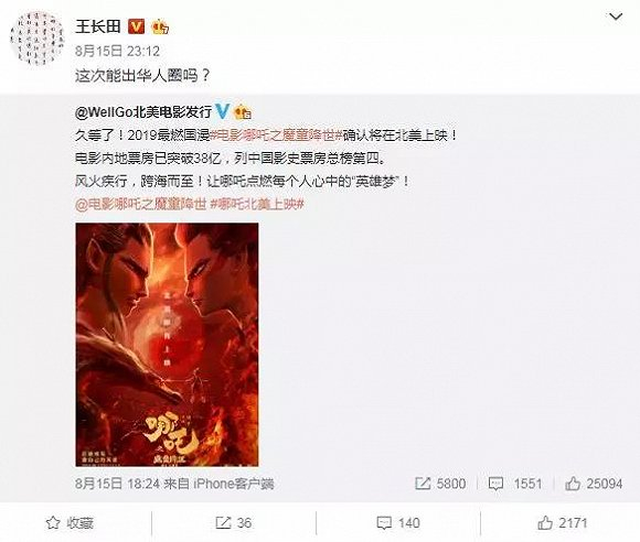 在Well Go宣布《哪吒》将在海外上映时,光线传媒董事长王长田就发出了一个疑问,“这次能出华人圈吗?”
