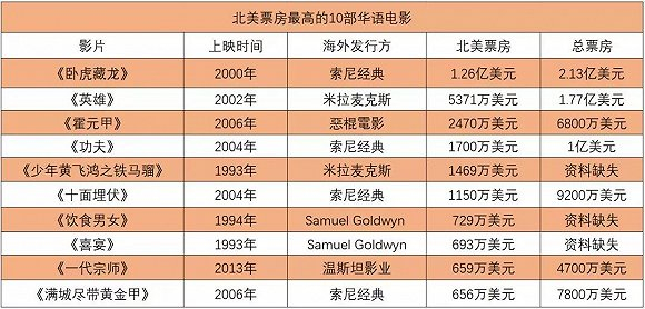 这十部电影中,《卧虎藏龙》不仅是北美票房最高的华语电影,也是北美票房最高的外语片,票房是第二名《美丽人生》的两倍。