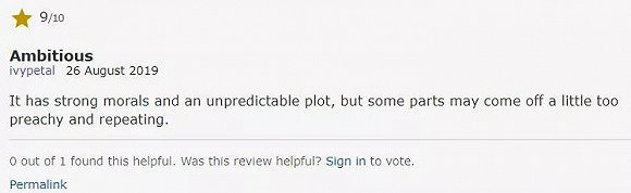 一位网名为“ivypetal”的IMDB用户给《哪吒》打了9分,他评价说:“这部电影有很强的寓意,情节也非常出乎意料,不过有些部分说教意味很浓。”