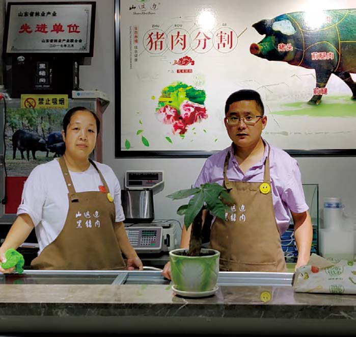 章庆华(右)打造了他的黑猪肉自有品牌“山这边”
