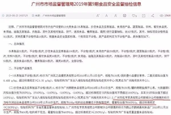 央视网报道称,8月28日,广东广州市市场监督管理局发布2019年第9期食品安全监督抽检信息,洽洽食品再次登上黑榜。广州市泓亨贸易有限公司新城分公司销售的标示为“哈尔滨洽洽食品有限公司”2018年12月08日生产、规格为108g/包的洽洽焦糖瓜子熟制葵花籽,霉菌检出值超过标准规定。公开资料显示,哈尔滨洽洽食品有限公司为洽洽食品子公司之一。