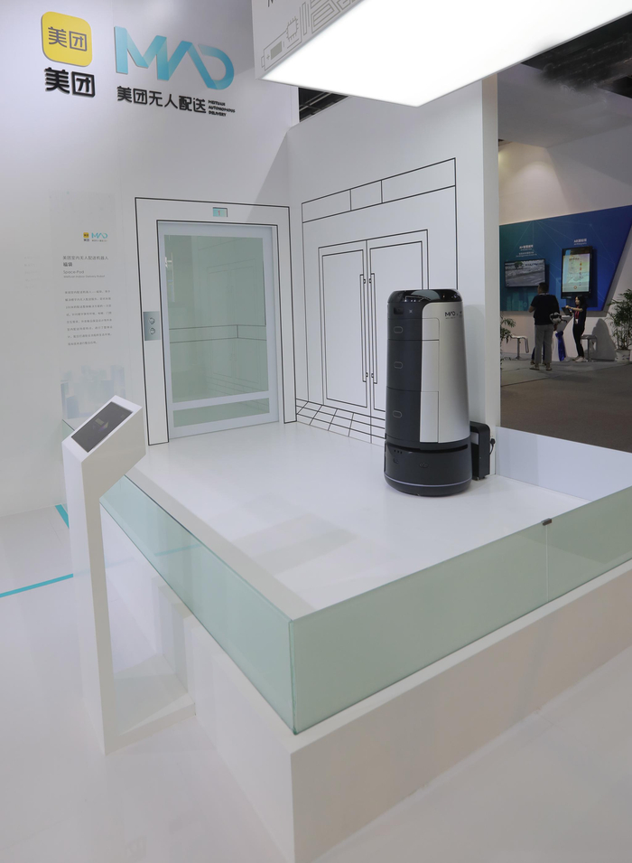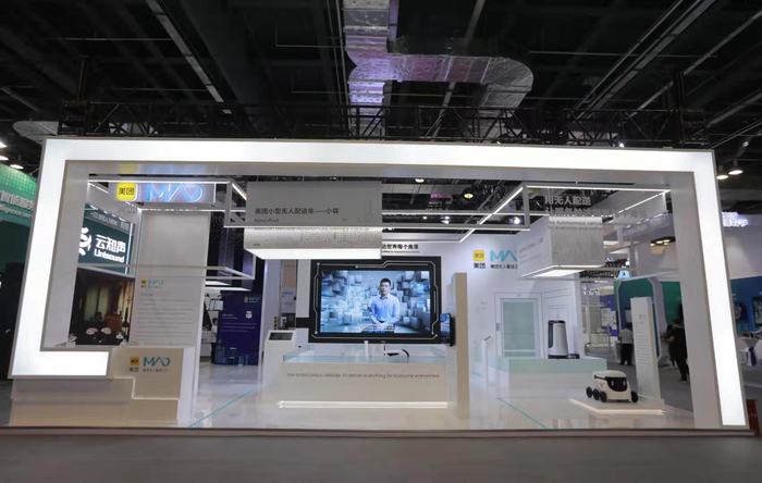 美团在世界人工智能大会的展位带来了在无人配送领域的研发成果,展示了小型无人配送车、室内无人配送机器人、无人机配送等。