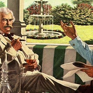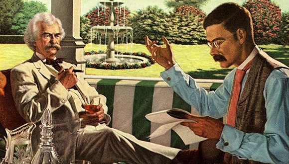 20世纪40年代的一则威士忌广告中,马克·吐温和鲁德亚德·吉卜林二人于19世纪80年代在美国纽约州埃尔迈拉县相见并畅饮波旁威士忌 图片来源:Alamy/ The New Republic