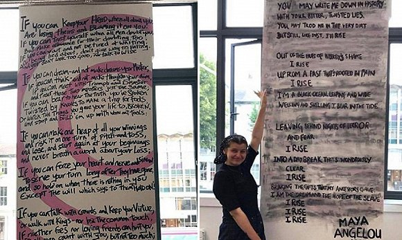 墙壁上原为吉卜林的诗歌《如果——》(左),一名学生在这首诗之上涂写了马娅·安杰卢的诗歌《我仍将奋起》 图片来源:The Guardian