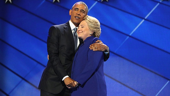 2016年7月27日,在宾夕法尼亚州费城的富国银行中心举行的民主党全国代表大会第三天的会议上,巴拉克·奥巴马和希拉里·克林顿拥抱在一起。图片来源:Joe Raedle / Getty Images