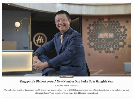 8月29日,《福布斯亚洲》杂志发布2019年新加坡富豪50强排行榜,海底捞老板张勇首次入榜,即以138亿美元(约合987亿元)身家,击败位居榜首10年的远东机构黄志祥和黄志达兄弟,成为新加坡首富。