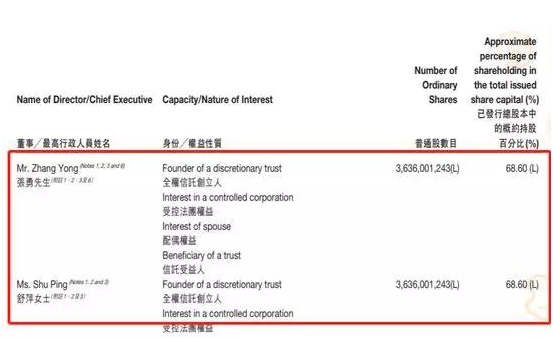 张勇夫妇两人合共拥有公司已发行股本总额的约68.6%权益。