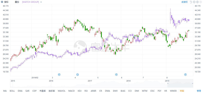 Match Group(紫线)与陌陌股价走势对比探探是不是下一个Tinder?