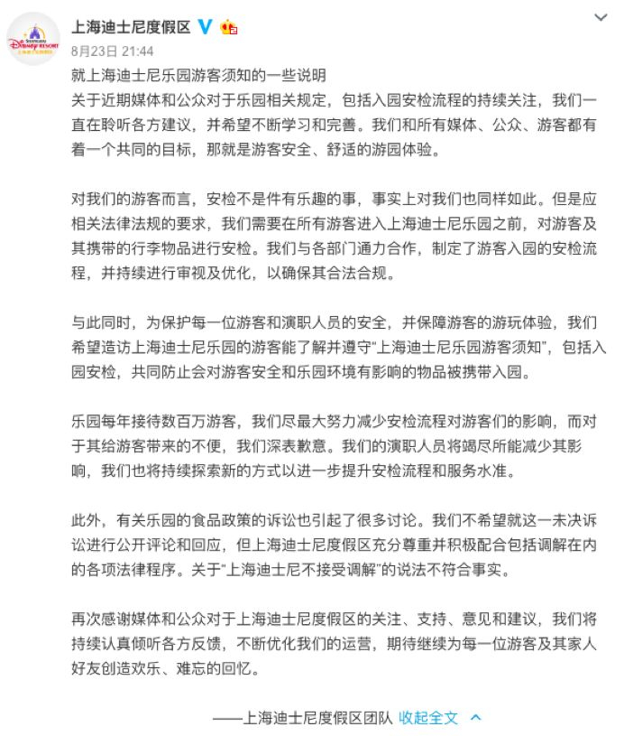 舆论压力下,上海迪士尼乐园不得不发表了一篇长文来进行说明,但看上去似乎并不打算改变自己“禁止携带食物入园”“入园需翻包检查”的规定。
