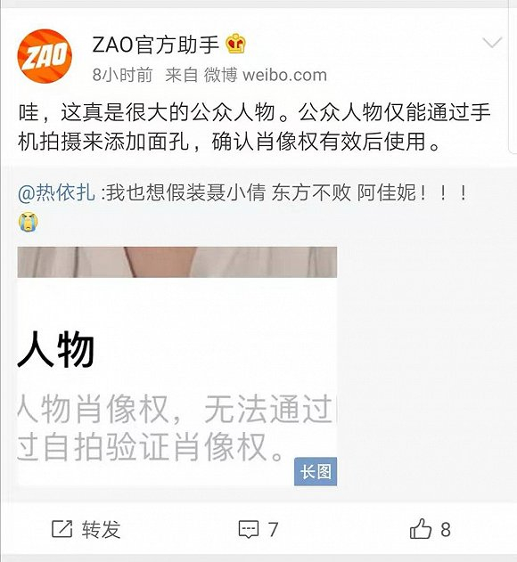 此外,ZAO对于公众人物还有特别保护,如果照片监测到公众人物,则无法添加图片。昨日,曾拍摄过长安十二时辰的热依扎就遇到了该问题,公博给出的回应是,公众人物如果想玩,可以通过手机拍摄来添加面孔。