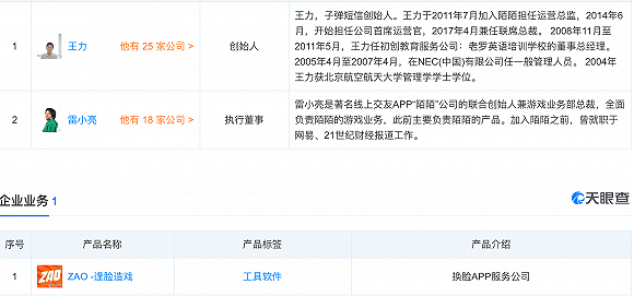 有意思的是,界面新闻记者在天眼查搜索“ZAO-逢脸造戏”的开发商“长沙深度融合网络科技有限公司”时发现,其创始人和执行董事是陌陌联席总裁王利和陌陌联合创始人雷小亮。