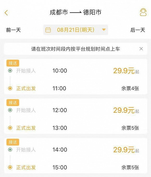 腾讯、滴滴入局,在一定程度上搅动了市场,但连这些作风高调的互联网巨头,在客运领域也显得较为保守。滴滴在城际客运领域的最新动作,是今年6月份和保定交通运输集团合作开通的保定至涞源/阜平的城际拼车;而今年5月滴滴与四川飞牛汽车运输有限公司在成都试点运营的城际拼车,目前在其APP成都站的页面中已不再显示。