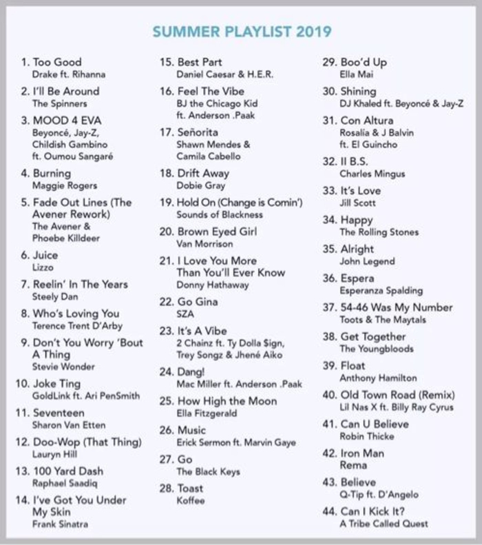 8月24日,奥巴马在个人推特上公布了他自己的“2019夏日音乐清单”。并且在配文中解释:作为美国的第44位总统,选择了44首好歌,这些“新歌、老歌、快歌、慢歌”都是他和米歇尔在这个夏天中最爱的单曲。其中被收录单曲Juice的演唱者Lizzo,在推特上“热烈回应”了奥巴马,并且单方面的表示:奥巴马就是我的挚友。
