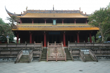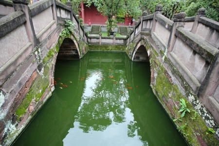 罨画池内还有一座著名的文庙,它始建于明朝朱元璋洪武年间,经明正德年间重修后,方具一定规模。明末四川经历最具破坏性的战乱,崇州文庙也在劫难逃。清康熙六年(1667)崇州文庙重建,在200多年里经过不断完善,直至光绪年间,方成今日规模。文庙南起正东街“万世师表”牌坊,北至罨画池公园的尊经阁,在大约1华里长的中轴线上一字排开,其间有孔子铜像、宫墙万仞、棂星门、泮池、戟门、大成殿、启圣殿。在中轴线的两侧,还分别对称地建有“德配天地”“道冠古今”两座牌坊,圣域、贤关两座仪门,以及孔踪、圣迹、东庑、西庑等。