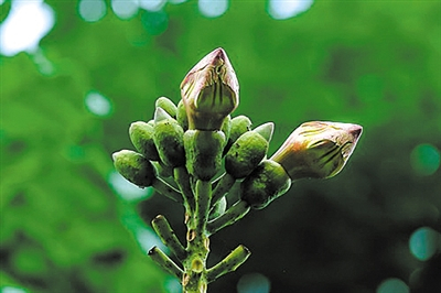 中国科学院华南植物园南药路的木蝴蝶今年又开花了。这种喜欢在夏秋之际夜晚盛放的木蝴蝶,开花并不多,而且还只在夜晚开花,到白天通常只能看到高高树梢上一簇紫红色的花苞聚在一起,像一支画笔一样指向天空。有时只能在地上看到几朵落花,所以有时稍不留意,就会错过了它的花季。