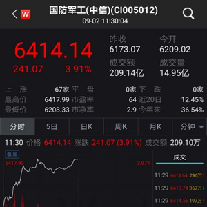 9月2日早盘,在国庆大阅兵的催化之下,军工板块迅速崛起。申万国防军工板块大涨3.77%,领涨A股,其中中国卫通、晨曦航空、航天发展等多只个股涨停,雷科防务、爱乐达、三角防务、航天通信等涨幅在7%以上。