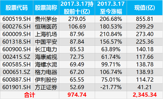 2017年3月17日,北向资金持股前十名股票是贵州茅台、恒瑞医药、上海机场、中国平安、长江电力、海康威视、海螺水泥、格力电器、伊利股份、方正证券。如果每只股票买入10万,当前将升值至213.99万元,也就是36.42%的复合年化收益率。如果完全按照北向资金的持仓比例操盘,收益会更高,100万投入至当前的净值将达到240.61万,折算成复合年化收益率为43.11%。