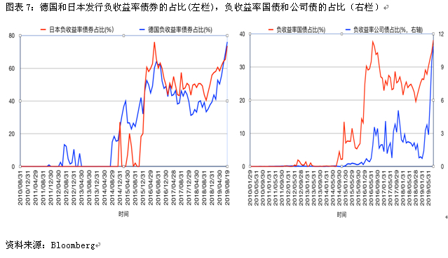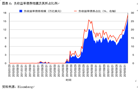 自2014年6月欧央行推出负利率以来,负收益率债券才成为市场上的常客。自2018年10月起,负收益率债券的规模快速攀升,在2019年3月超过了10万亿美元,又分别于5、6、7月超过了11万亿、12万亿、14万亿美元。
