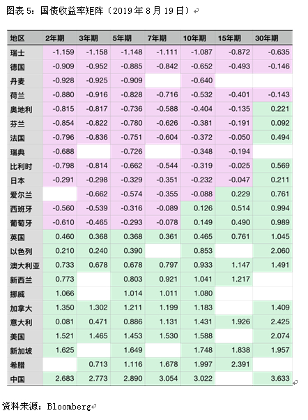 在负利率政策的推动下,相应国家的国债也进入了负收益率时代。瑞士、德国、丹麦、荷兰和瑞典这五个国家从2年到30年期所有期限国债的收益率都是负的。奥地利、芬兰、法国、比利时和日本等国,绝大部分期限国债的收益率是负的,只有30年期国债的收益率是正的。挪威、加拿大、美国、新加坡和中国发行的2年期及以上的国债收益率是正的,且收益率相对较高,各个期限的收益率都在1%以上。英国国债的收益率虽然都是正的,但相对较低,只有30年期的收益率达到了1.045%,其他期限的收益率都在1%以下。