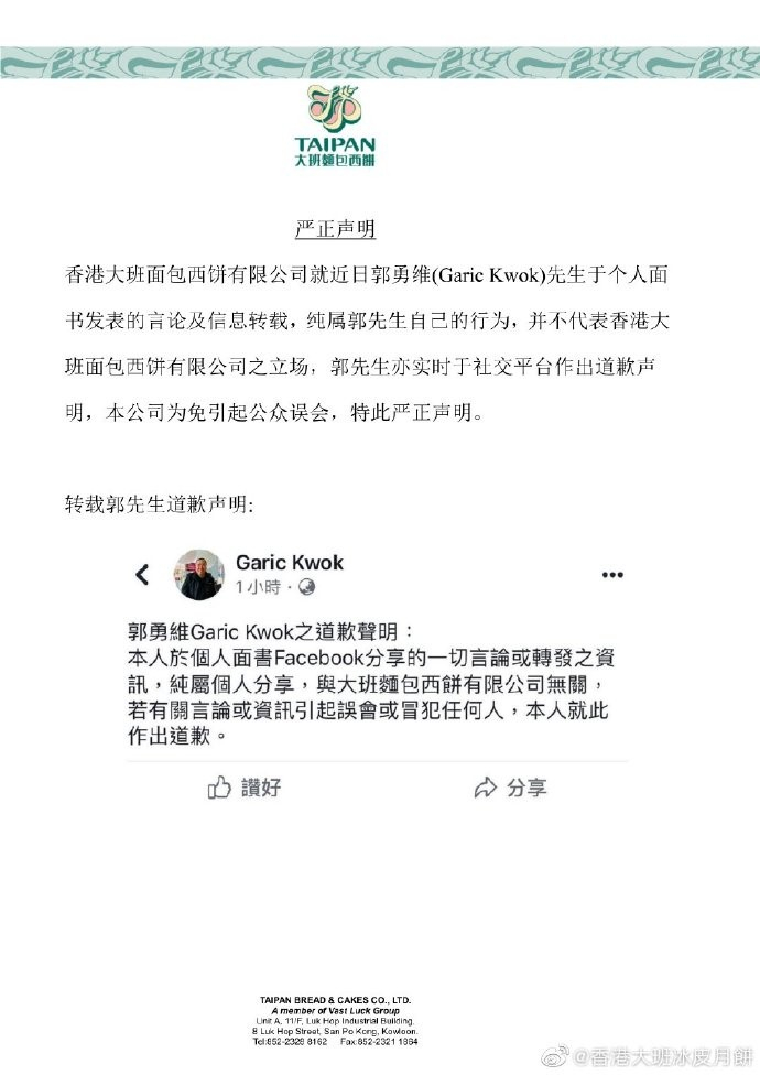 该声明下方,还附有郭勇维在社交媒体上发表的道歉声明,称其一切言论或转发的资讯纯属个人分享,与大班面包西饼有限公司无关。