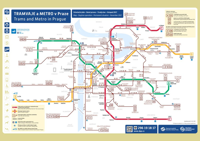 △ 布拉格公共交通地图,绿、黄、红分别为地铁 A、B、C 三条线,红棕色路线为电车路线。图片来源 | 布拉格交通运输有限公司(The Prague Public Transit Company),捷克语中简称 DPP