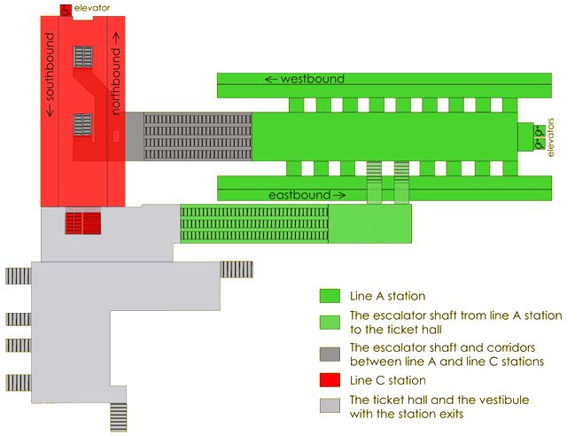 △ 博物馆站的平面设计图,A(绿)、C(红)两条地铁线的设计明显不同。图片来源 | Angrenost.cz