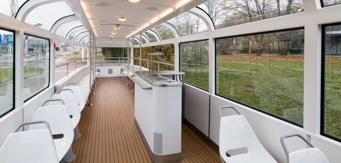 △ Anna 偕同工作室 Anna Studio 为让 T3 COUPÉ 设计的新外形最大限度保留了 T3 的模样,向“老前辈”交通工具发出了致敬。内部的吧台受到 1950 年 T1 车型启发,原本的功能是售票区域;车顶天窗效仿了 Škoda 706 RTO 巴士。车身大面积地玻璃,意图营造半开放式体验,方便社交。图片来源 | t3coupe.com