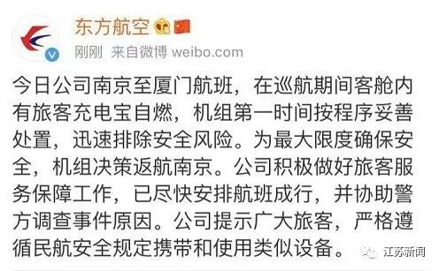 今天一早,南京飞厦门的MU2809航班因旅客充电宝自燃起飞后返航,于南京禄口机场落地