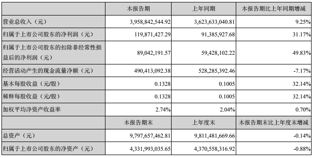 据了解,报告期公司实现营业总收入39.58亿元,较去年同期增长9.25%;归属于上市公司股东的净利润1.20元,较去年同期增长31.17%。