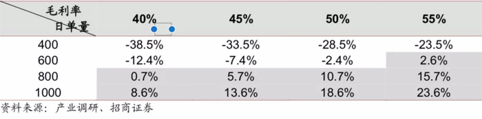 进一步对单店模型进行敏感性分析,发现净利率对于日单量极度敏感,日单量减少200单,带动净利率最高能有20+pct 的波动,在假定40元客单价的情况下,800单左右是一个门店前台的盈亏平衡点。