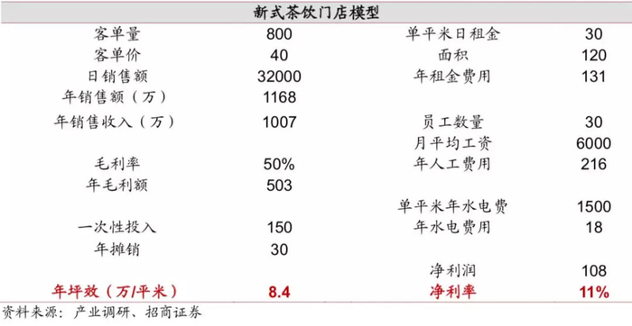 基于产业和草根调研我们拆解出成熟的头部新式茶饮店的单店模型,从模型来看,如果在客单量800,客单价40元,毛利率50%的情况下,年销售收入达千万左右,净利润百万左右,净利率11%,和其他零售业态相比利润率可观。主要原因在于高坪效和高毛利,费用端人工和租金占比较高,初期一次性投入的回收期大概在1.5年左右。