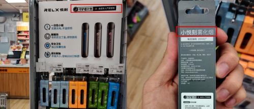 可以看到,悦刻在包装上标注着“未成年禁用”的标识,而外包装、口味设计上仍与食品类似。颜色缤纷的外端、友善和谐的广告标语,这些产品打着“健康”、“戒烟”的旗号,以几十元左右价格混在生活用品区,抢夺着着年轻人的注意力。