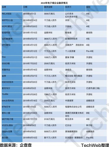源码资本、IDG、同创伟业、真格基金等颇有名气的创投机构争先布局电子烟,资本巨头的进入也加速了RELX悦刻、爱卓依IJOY、gippro等企业的飞速扩张。据TechWeb从企查查获得的数据统计,2019年,仅仅是电子烟初创公司(注册至今不超过3年),就总计拿到了千万、亿级融资。