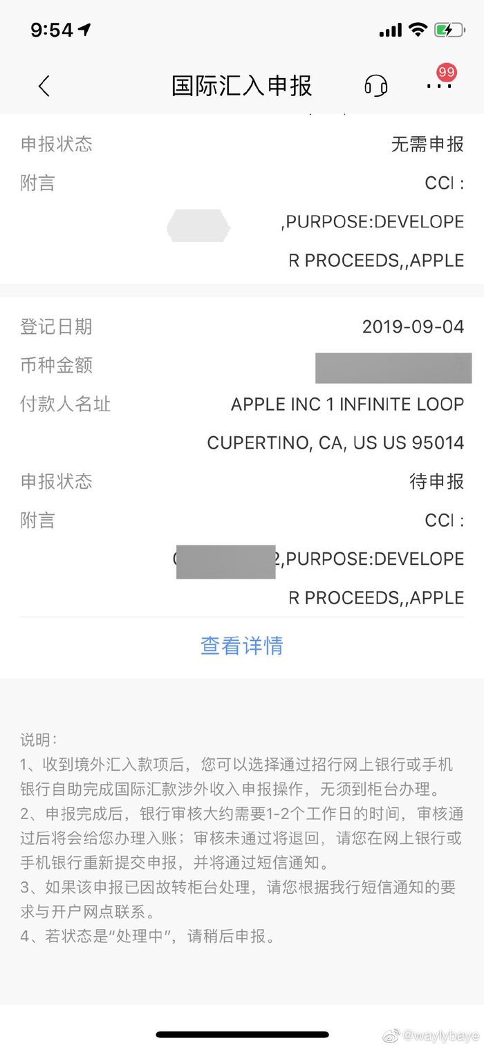 9月4日,有开发者称一大早起来看短信,发现收到来自苹果的一笔美元巨款,金额是往月的六、七倍。后来发现这不是个例,是苹果公司把人民币的金额搞错成美元直接打过来了。