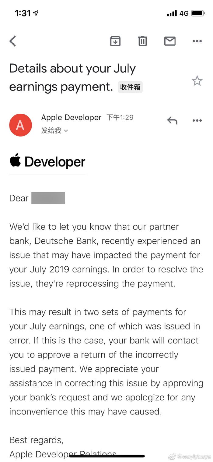 不过,一天后,已经有部分开发者收到了苹果发来的“解释邮件”,苹果在邮件中称“错用美元结算”是因为合作的德意志银行操作失误,并且希望开发者能够协助银行进行退汇。