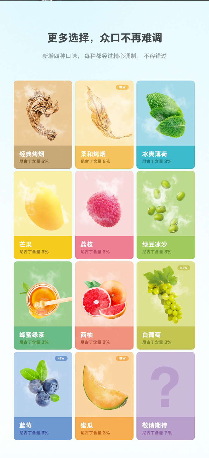 蓝莓、加州芒果、台湾凤梨、绿豆沙、咖啡,看到这些五颜六色的口味,你仿佛不是在挑选电子烟,而是在思考今天想吃什么口味的棒棒冰。