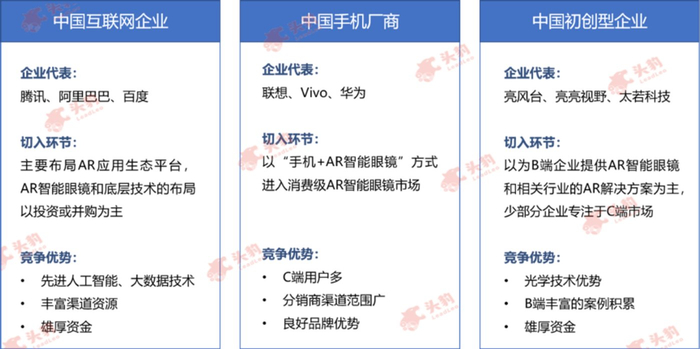 现阶段,中国AR智能眼镜行业处于探索发展期,行业市场规模逐年增长,但受到行业技术壁垒高的影响,行业参与者不多,可分为中国科技巨头企业、中国手机厂商和初创型企业,其竞争优势各异,具体而言:
