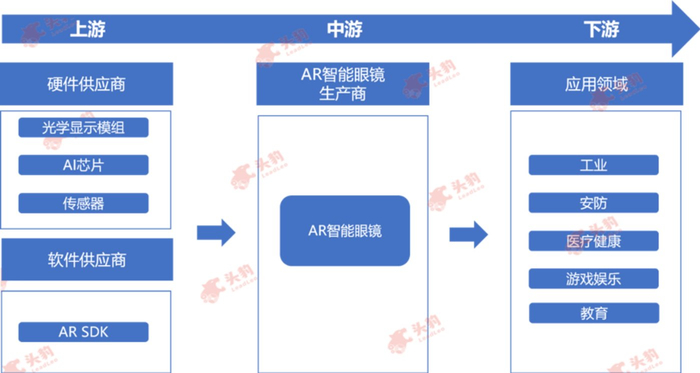 AR智能眼镜产业链由以下三部分组成:产业链上游参与者是硬件供应商和软件供应商;产业链中游主体是AR智能眼镜生产商;产业链下游应用领域包括工业、安防、医疗健康、游戏娱乐、教育等。